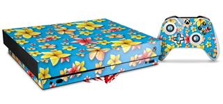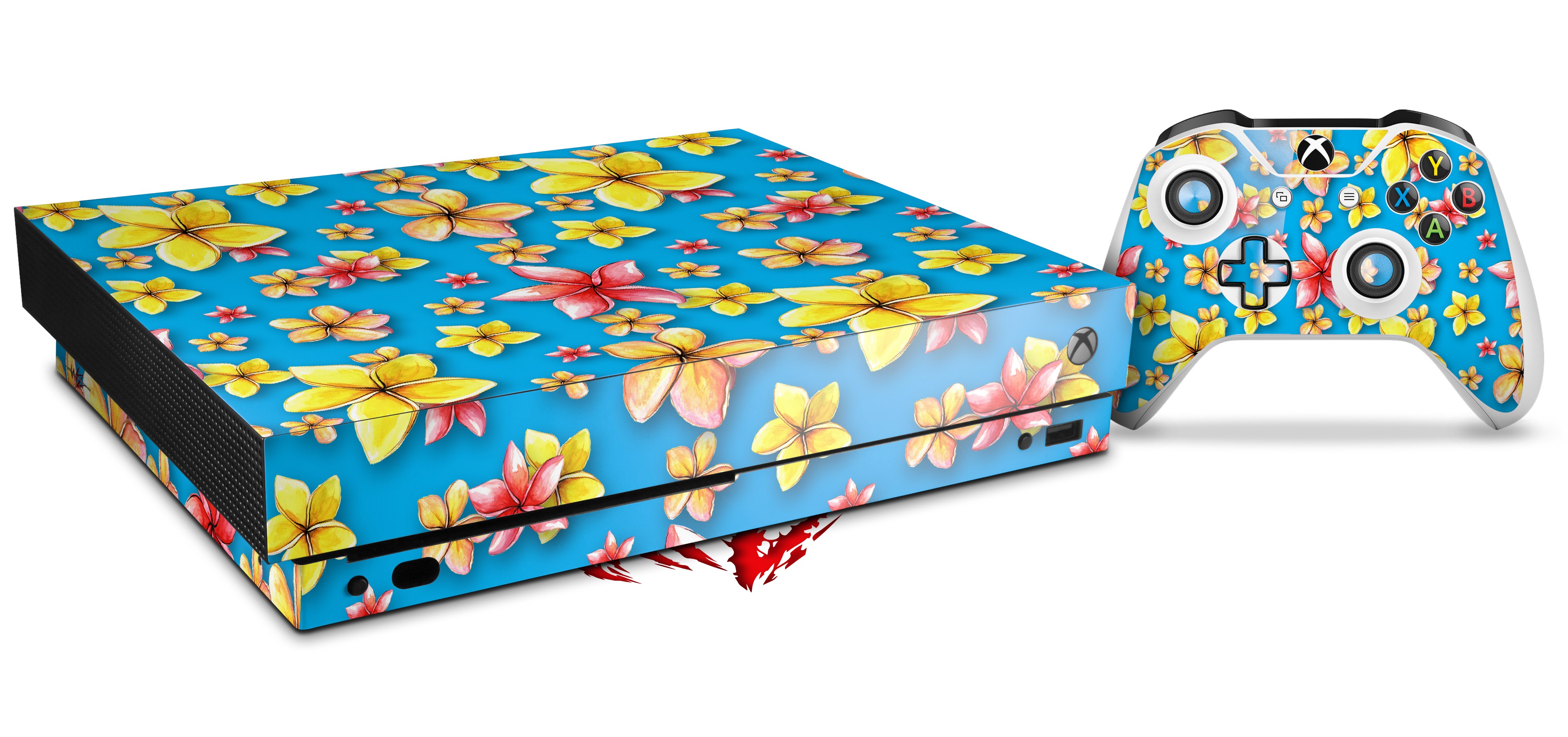 Skin Wrap for XBOX One X Console and Controller Beach Flowers Blue Medium