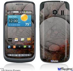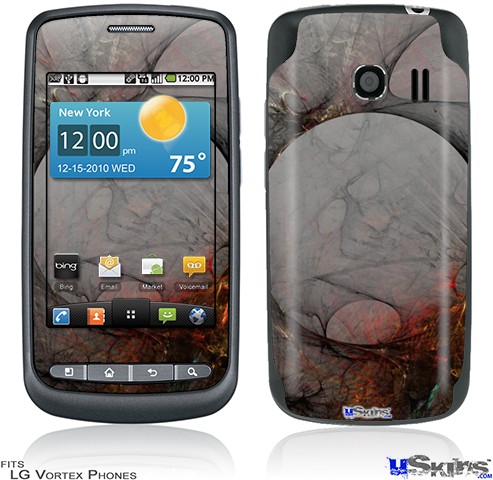 Skin covers front and back of LG Vortex cell phone.