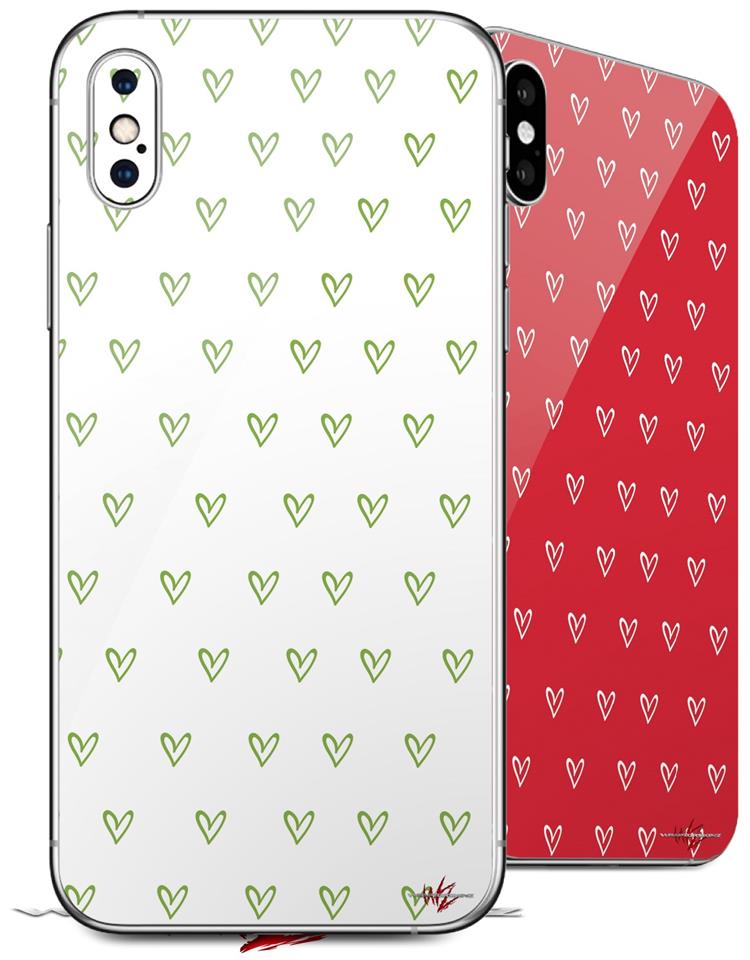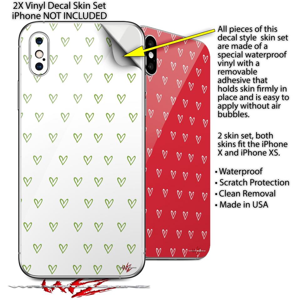 2 Decal style Skin Wraps set for Apple iPhone X and XS Hearts Green