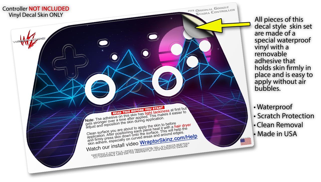 This product is in no way affiliated with or endorsed by Google. WraptorSkinz® skin wraps work with the Original Google Stadia version 1 Controller. Printed using superb photo quality designs and vibrant colors printed with special fade resistant inks that last even in direct sun for years. WraptorSkinz are a composite of two layers of commercial grade materials. The bottom layer is a soft, flexible vinyl with a special removable adhesive that is easily positioned, applied without air bubbles. Next, we print the bottom layer with UV protected, fade resistant inks that deliver superb photo quality designs in vibrant colors. Finally, we bond a professional grade laminate over the entire skin adding a glossy protective finish.