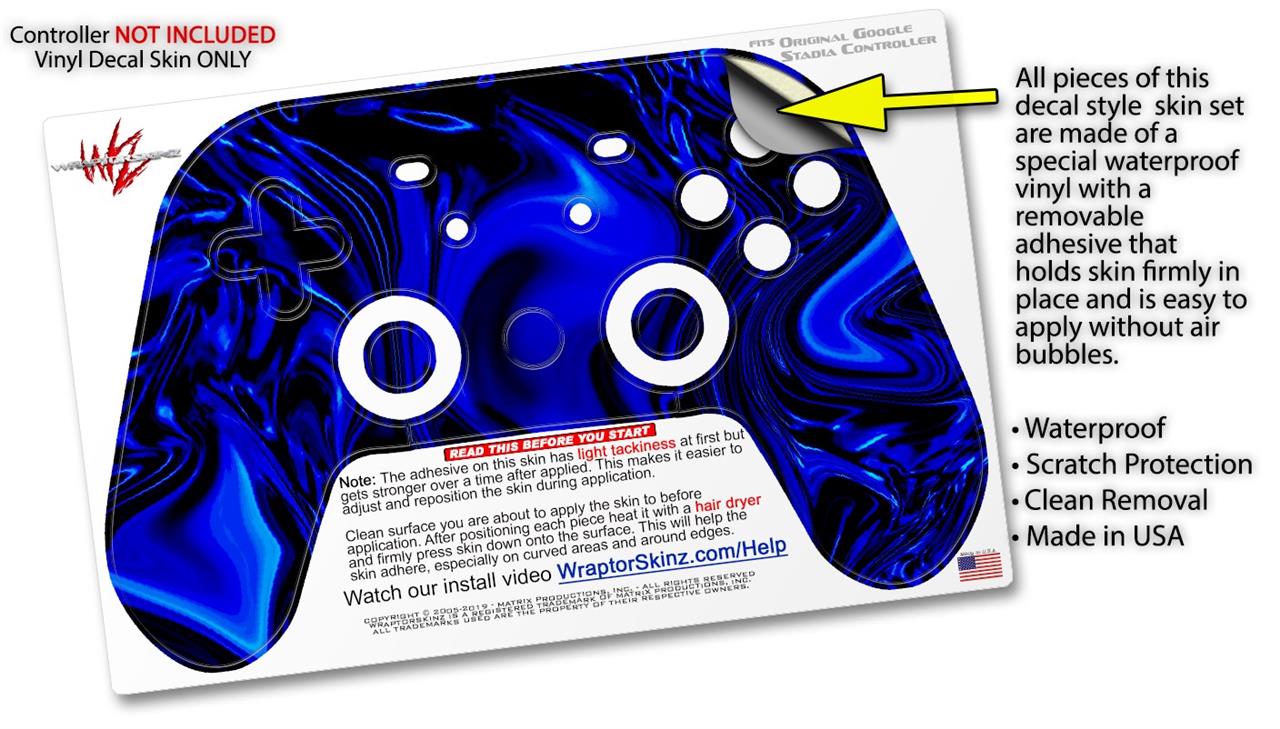 This product is in no way affiliated with or endorsed by Google. WraptorSkinz® skin wraps work with the Original Google Stadia version 1 Controller. Printed using superb photo quality designs and vibrant colors printed with special fade resistant inks that last even in direct sun for years. WraptorSkinz are a composite of two layers of commercial grade materials. The bottom layer is a soft, flexible vinyl with a special removable adhesive that is easily positioned, applied without air bubbles. Next, we print the bottom layer with UV protected, fade resistant inks that deliver superb photo quality designs in vibrant colors. Finally, we bond a professional grade laminate over the entire skin adding a glossy protective finish.