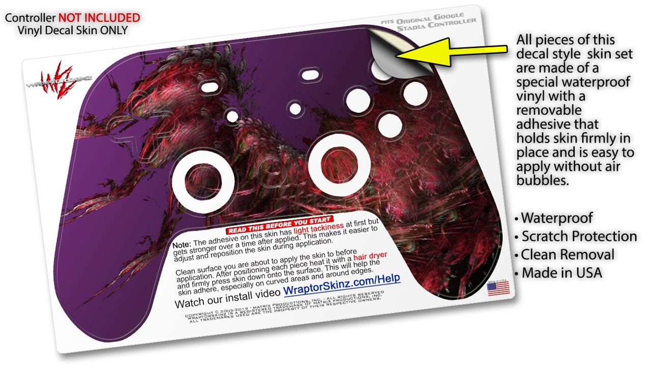 This product is in no way affiliated with or endorsed by Google. WraptorSkinz® skin wraps work with the Original Google Stadia version 1 Controller. Printed using superb photo quality designs and vibrant colors printed with special fade resistant inks that last even in direct sun for years. WraptorSkinz are a composite of two layers of commercial grade materials. The bottom layer is a soft, flexible vinyl with a special removable adhesive that is easily positioned, applied without air bubbles. Next, we print the bottom layer with UV protected, fade resistant inks that deliver superb photo quality designs in vibrant colors. Finally, we bond a professional grade laminate over the entire skin adding a glossy protective finish.