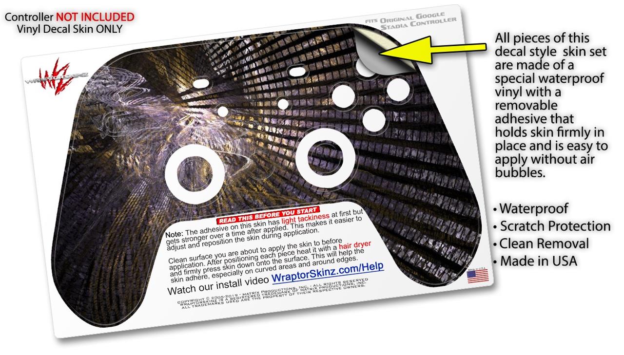 This product is in no way affiliated with or endorsed by Google. WraptorSkinz® skin wraps work with the Original Google Stadia version 1 Controller. Printed using superb photo quality designs and vibrant colors printed with special fade resistant inks that last even in direct sun for years. WraptorSkinz are a composite of two layers of commercial grade materials. The bottom layer is a soft, flexible vinyl with a special removable adhesive that is easily positioned, applied without air bubbles. Next, we print the bottom layer with UV protected, fade resistant inks that deliver superb photo quality designs in vibrant colors. Finally, we bond a professional grade laminate over the entire skin adding a glossy protective finish.
