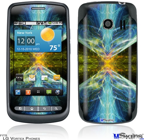 Skin covers front and back of LG Vortex cell phone.